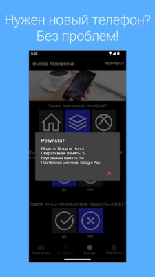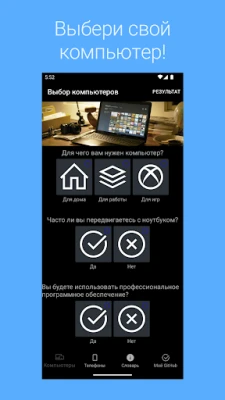 The application will help you identify the computer: by RAM, form factor, hard disk, video card, processor, as well as the operating system And if you need a smartphone, then according to the minimum characteristics, so that it is much easier for you to decide before buying. Directly from the app, you can go to Yandex.Market for shopping and view the code in GitHub!