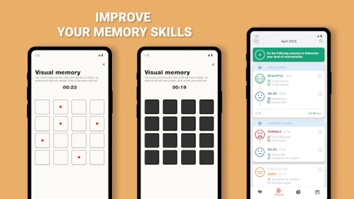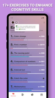 On the main screen you are offered a set of exercises, select an exercise and its description will open. Click the strat button and begin the exercise. The program will ask you to perform a series of two approaches, this is done to more accurately assess your cognitive abilities and reduce the error in the calculations. After completing the exercise, the app will evaluate your result and show your progress on the statistics tab.